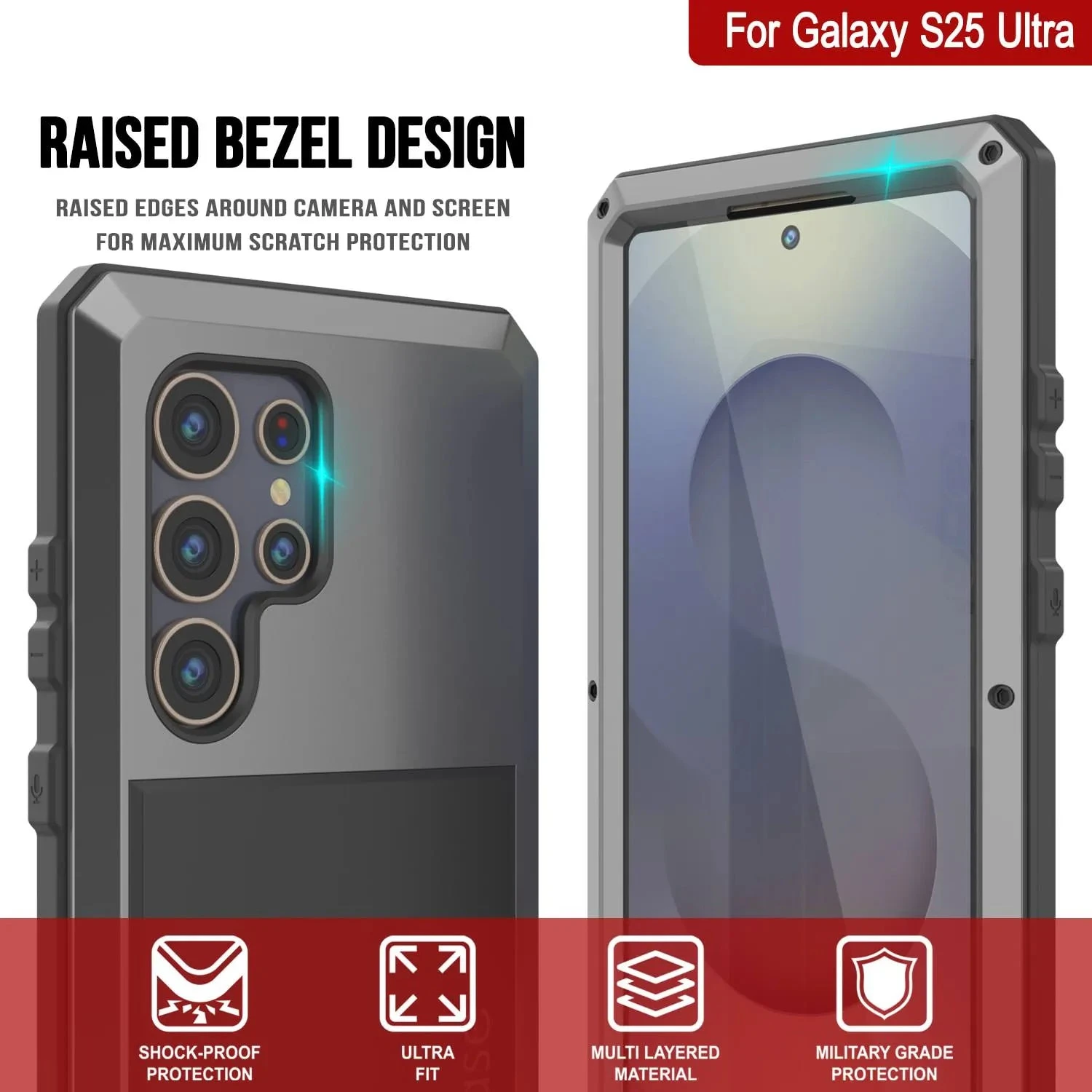 - ★ ULTIMATE DUAL LAYER PROTECTION: Ultra tough front and back aluminum frames enclose a shock-absorbing TPU layer resulting in superior protection from drops and falls | Additional CAMERA LENS PROTECTION due to raised bevel |HONEYCOMB COOLING SYSTEM: Specially molded cooling grooves in the back of the case ensure heat dissipation to protect your Galaxy S25 Ultra from damage due to overheating