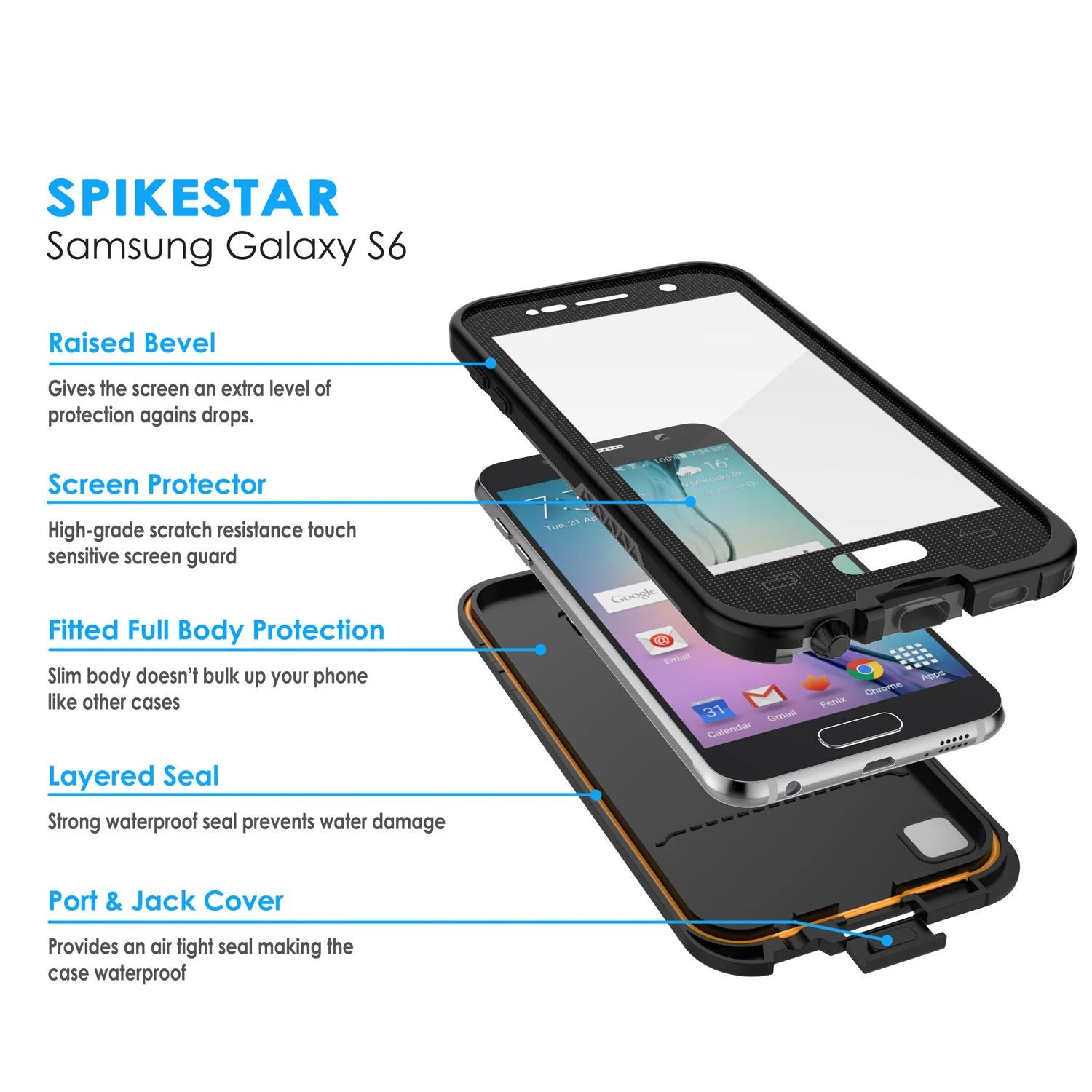 - The SpikeStar Case has been tested for up to 6.6ft deep and 10 minutes in the water. Waterproof, Dustproof, Snowproof, Mudproof, Shockproof and it has a HD clear scratch resistant screen guard to complete the protection.