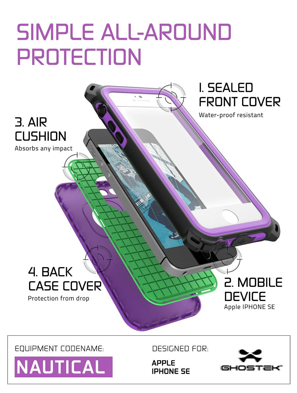 iPhone SE/5S/5 Waterproof Case, Ghostek® Nautical Series for Apple iPhone SE/5S/5 | Underwater | Shockproof | Dirt-proof | Snow-proof | Aluminum Frame | Adventure Ready | Ultra Fit | Swimming (Purple)